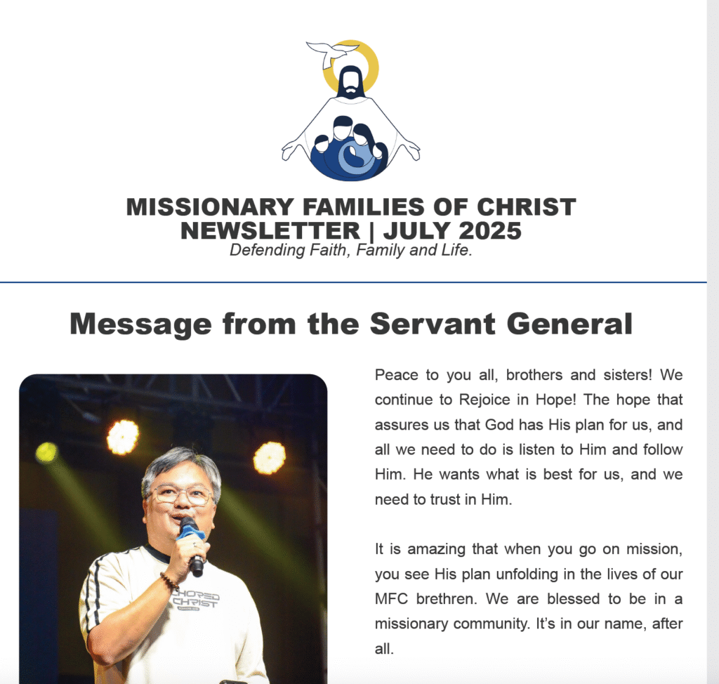 Welcome to our Missionary Families of Christ online newsletter! We send this out via email every month, and if you want to be put in the mailing list, just let us know via sending an email to: secretariat@missionaryfamiliesofchrist